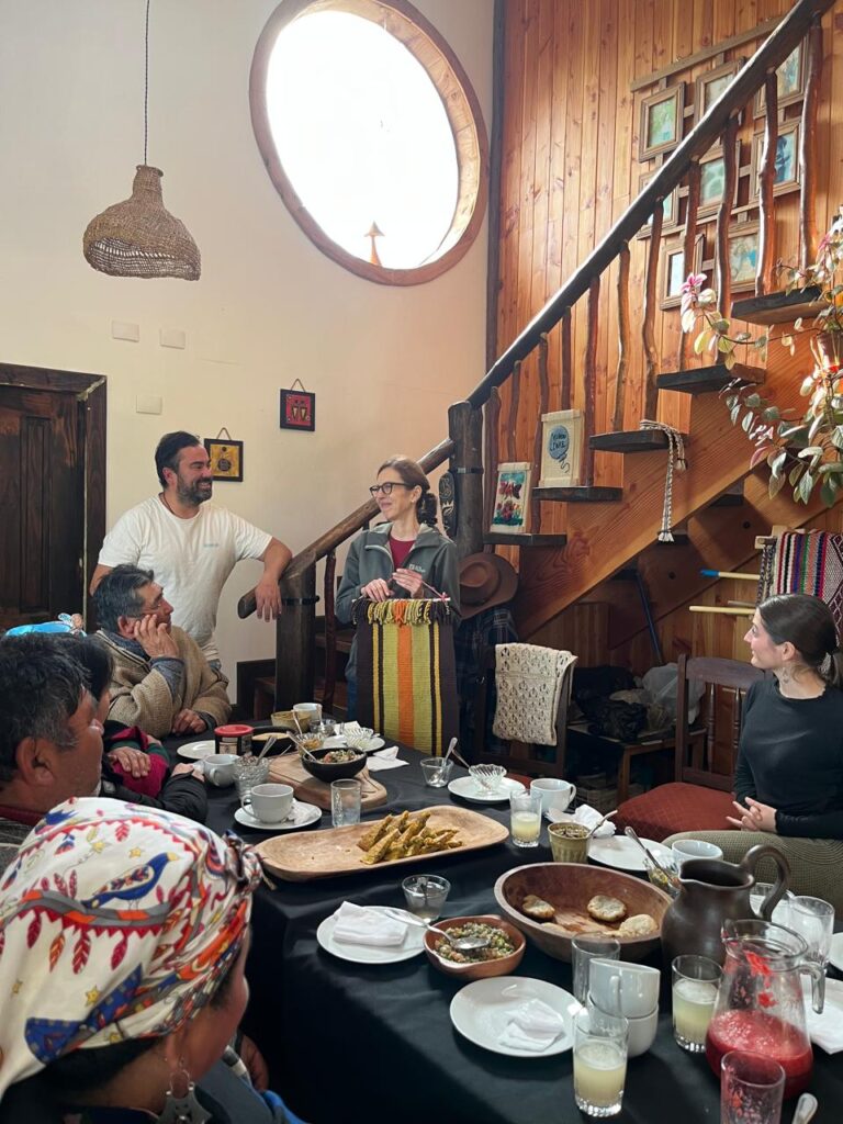 Un momento muy especial de la visita se dio en torno a la mesa, en la que junto a los anfitriones compartieron mates, muday, milcaos y ceviche de cochayuyo, entre otros platos tradicionales de la cocina mapuche. El momento propició reflexiones profundas y relatos de la historia del territorio que habitan (territorio ancestral de origen Külche Mapu), así como la defensa y protección de bosques y aguas, que su pueblo ha hecho como parte de su identidad y cosmovisión.