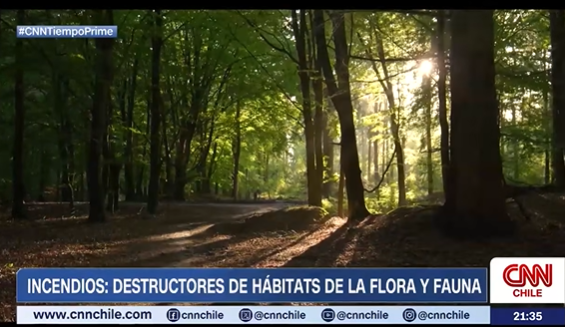 El crítico impacto de los incendios forestales en la biodiversidad del país, fue el tema que recientemente abordó el espacio Tiempo Prime de CNN Chile, con la participación de Pablo Parra, Director de Bosquentrama, y Miguel Díaz, médico veterinario de CONAF. Ver noticia